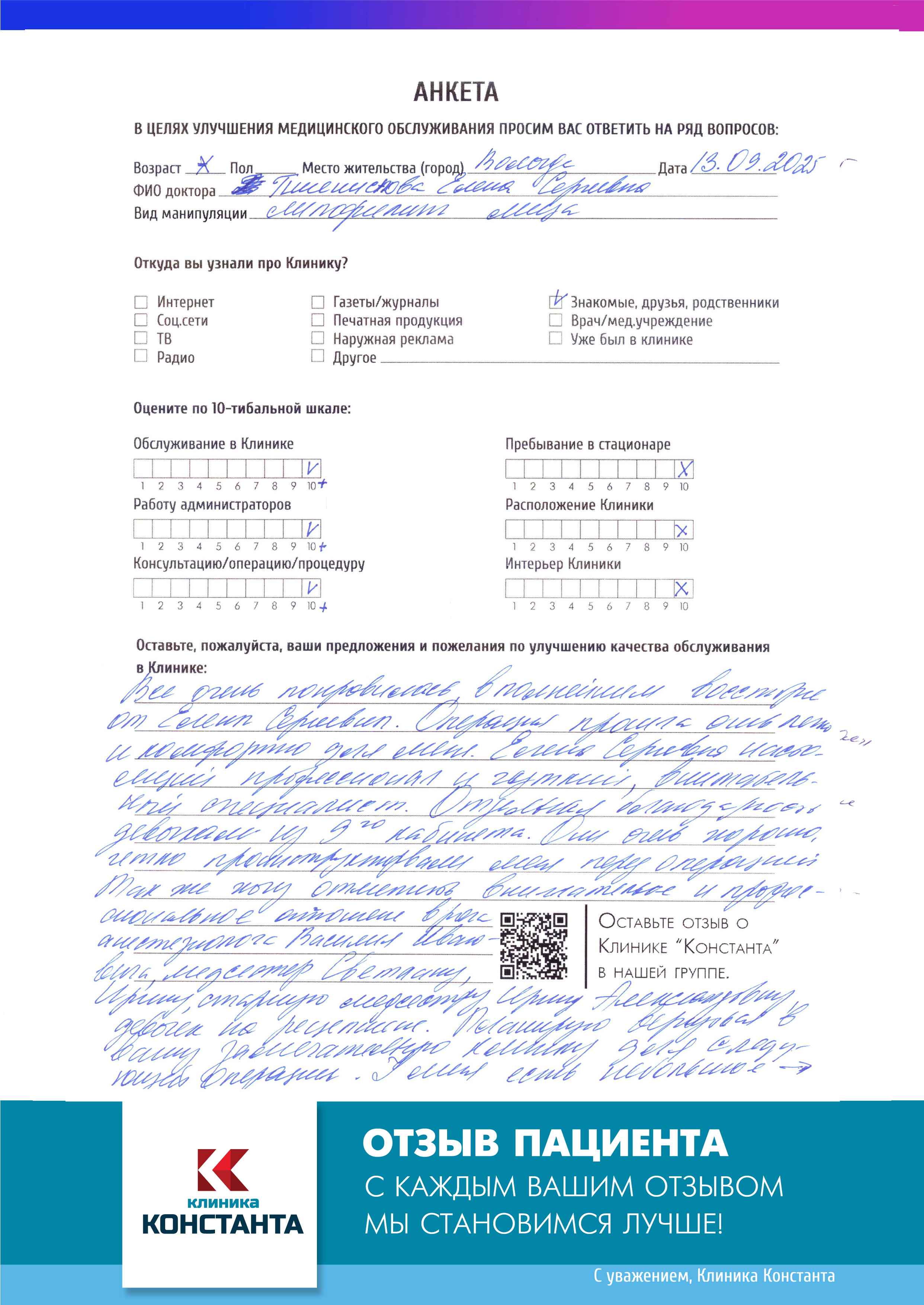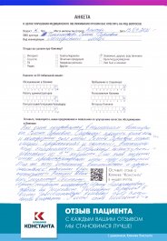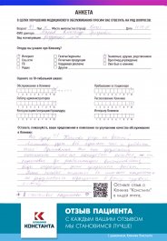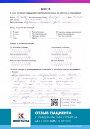 Мы гордимся тем, как наши пациенты отзываются о врачах и сервисе Клиники «Константа». Если Вы никогда не были в нашей Клинике и еще не знакомы с культурой и атмосферой «Константы», приглашаем Вас ознакомиться с мнением наших пациентов.